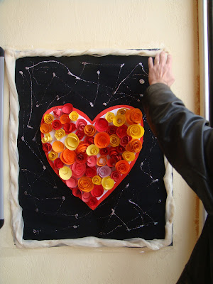 Εκέλεση:σχεδιάζουμε στο χαρτόνι μικρά ή μεγάλα σαλιγκαράκια στη συνέχεια αρχίζουμε να διπλώνουμε από την έξω άκρη μέχρι να σχηματιστεί ένα λουλούδι.Κατόπιν το κολλάμε σε σχήμα καρδιάς για να χωρέσουμε όλοι στη μεγάλη αυτή αγκαλιά της αγάπης.